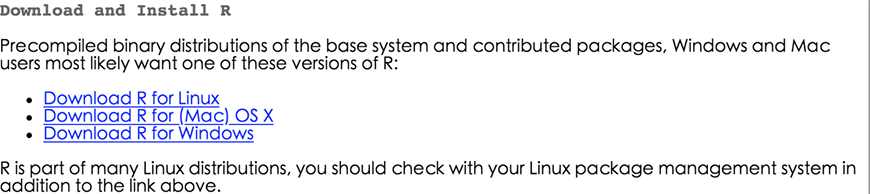 R 获取:跨 Windows/macOS/Linux,去 CRAN 下载最新发行版并安装。安装完成后直接从应用目录启动 R 控制台。The Comprehensive R Archive Network