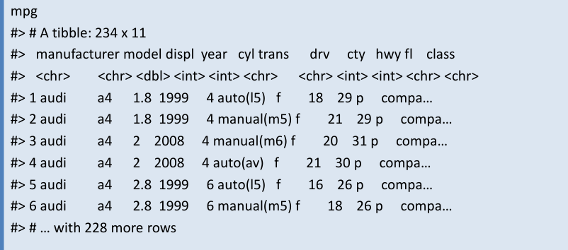 ggplot2::mpg(EPA 采集的 38 类车型相关数据,234×11):先?mpg查看字段含义。您可以探索 ggplot2 中的 mpg 数据框(即 ggplot2::mpg)。数据框是一种按变量(列)和观测值(行)组成的矩形集合。mpg 包含美国环境保护局收集的 38 款车型的观测数据。