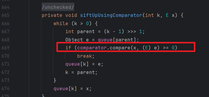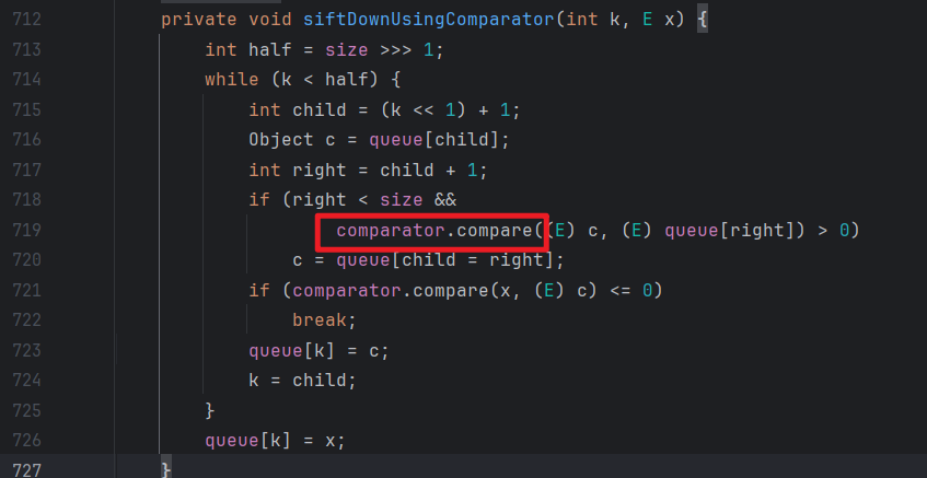 TransformingComparator这个类没有可用的readobject()方法,因此继续往前找,可以找到PriorityQueue#siftDownUsingComparator()方法调用了compare(),如下图: