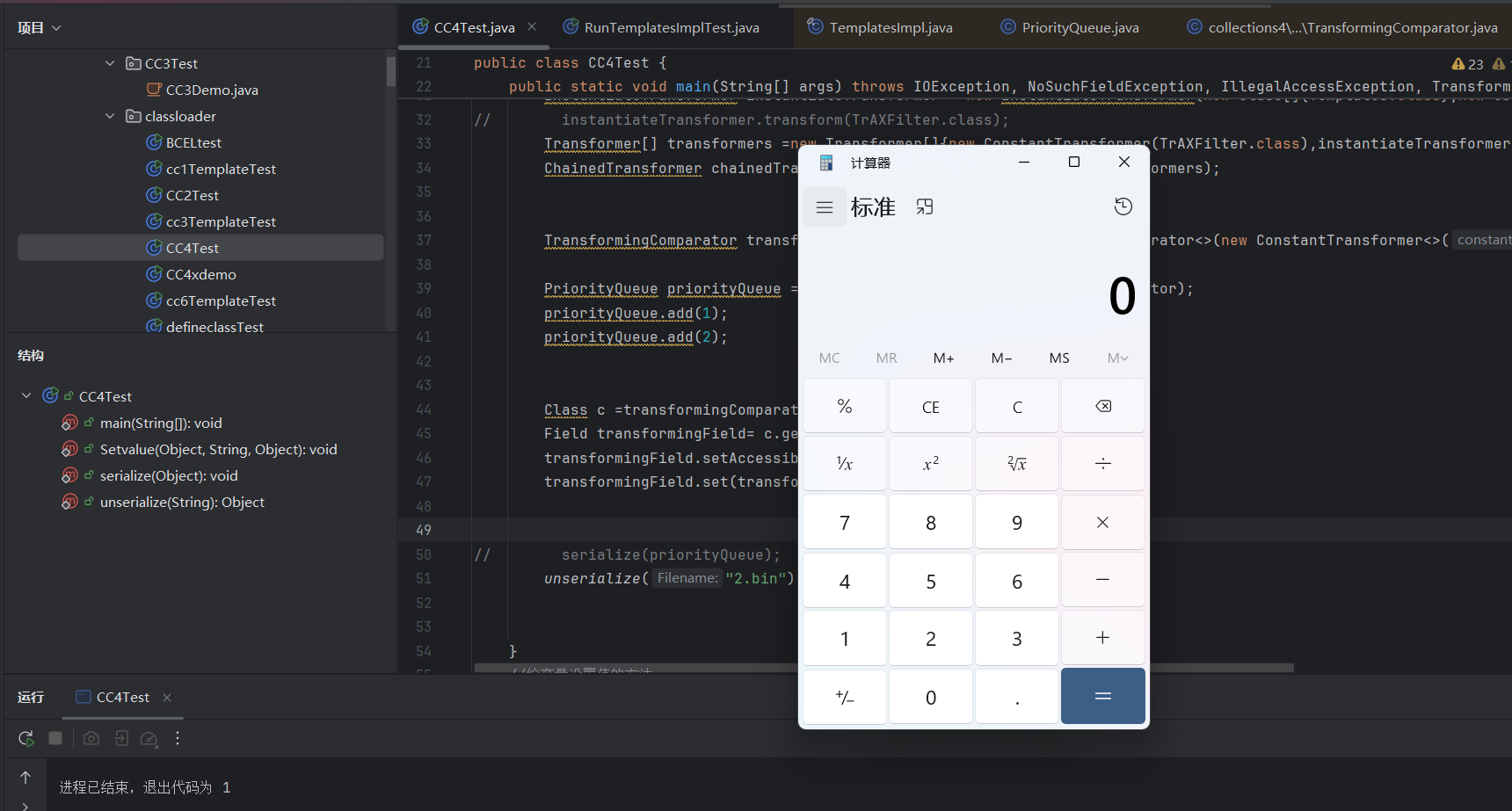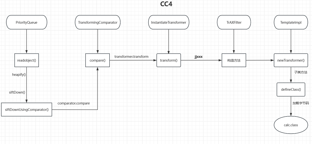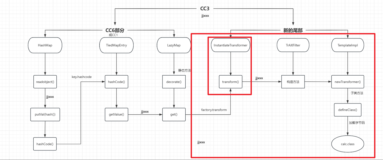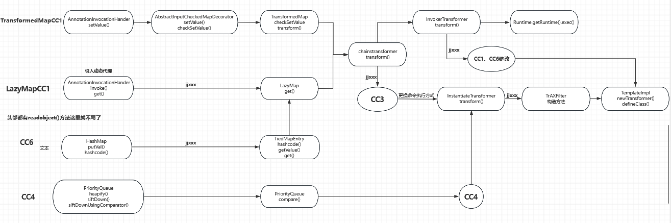 CC4链子执行命令的方式和CC3相同,都是通过加载字节码的方式,因此该链的后半部分拿着CC3的poc用就行了。