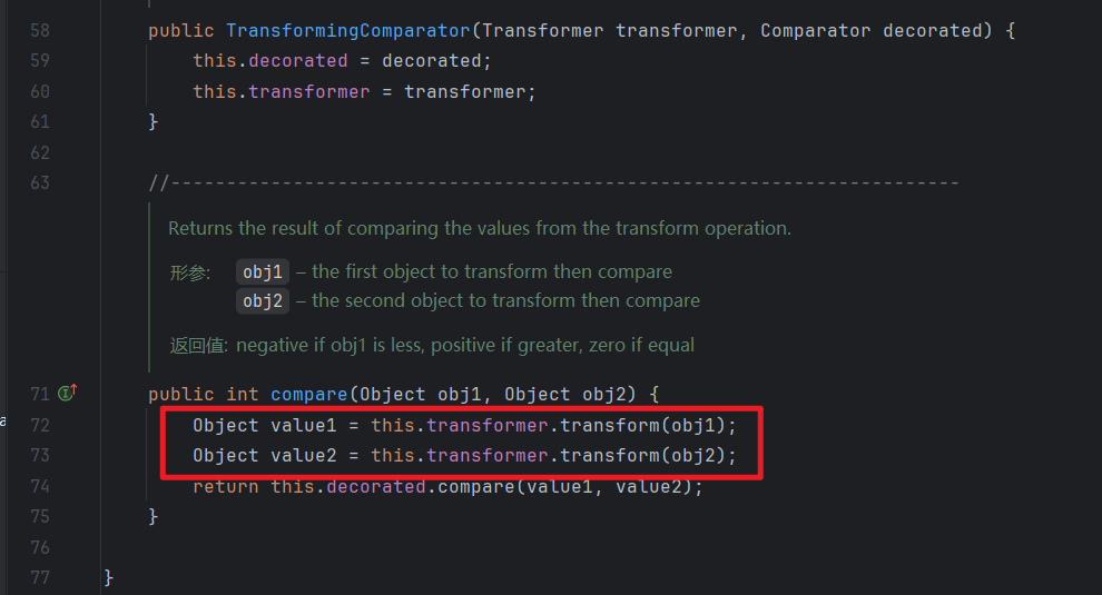 其中在TransformingComparator#compare()方法中看到调用了transform()方法