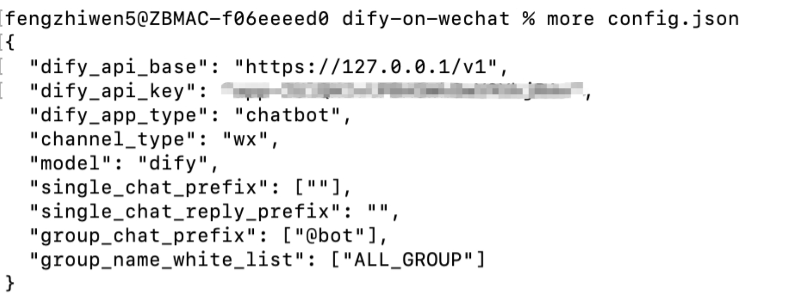 在项目根目录创建名为config.json的文件,文件内容如下,请把dify_api_base配置为API服务器地址;dify_api_key配置为API密钥其他配置保持不变。