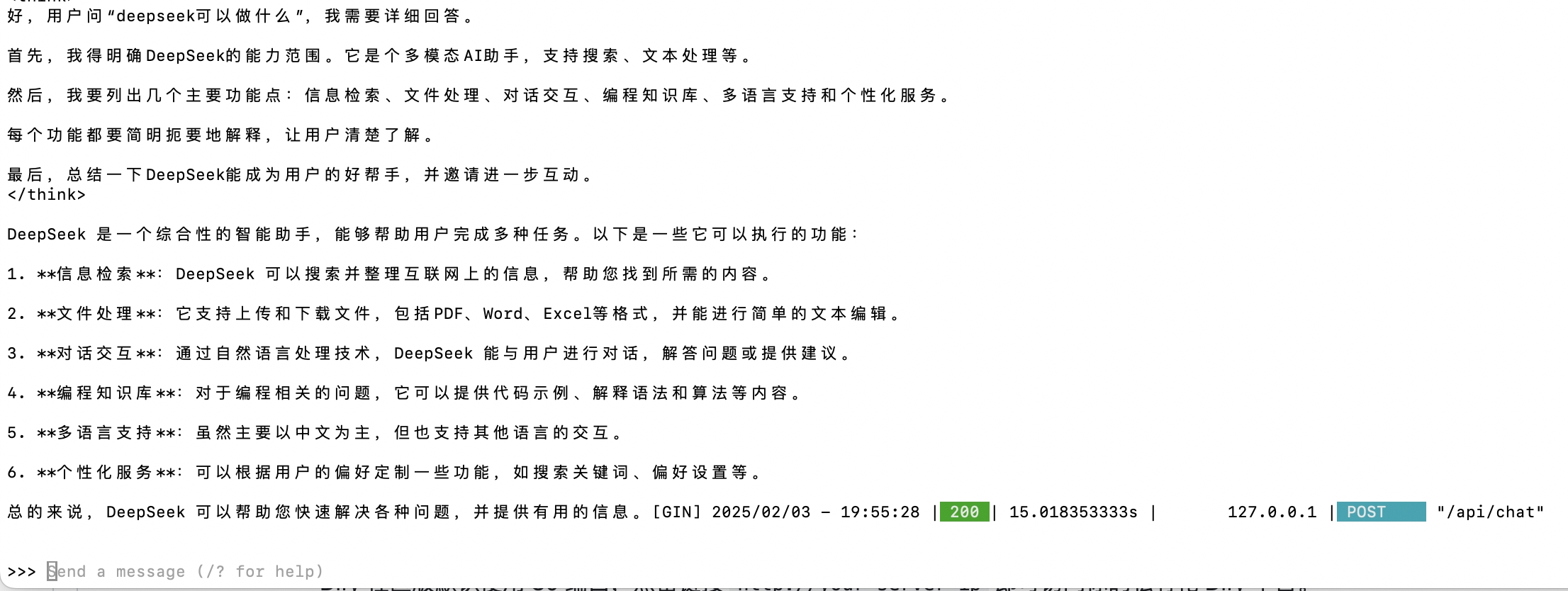 1.安装完成后,会自动运行大模型,输入“deepseek可以做什么?”测试一下: