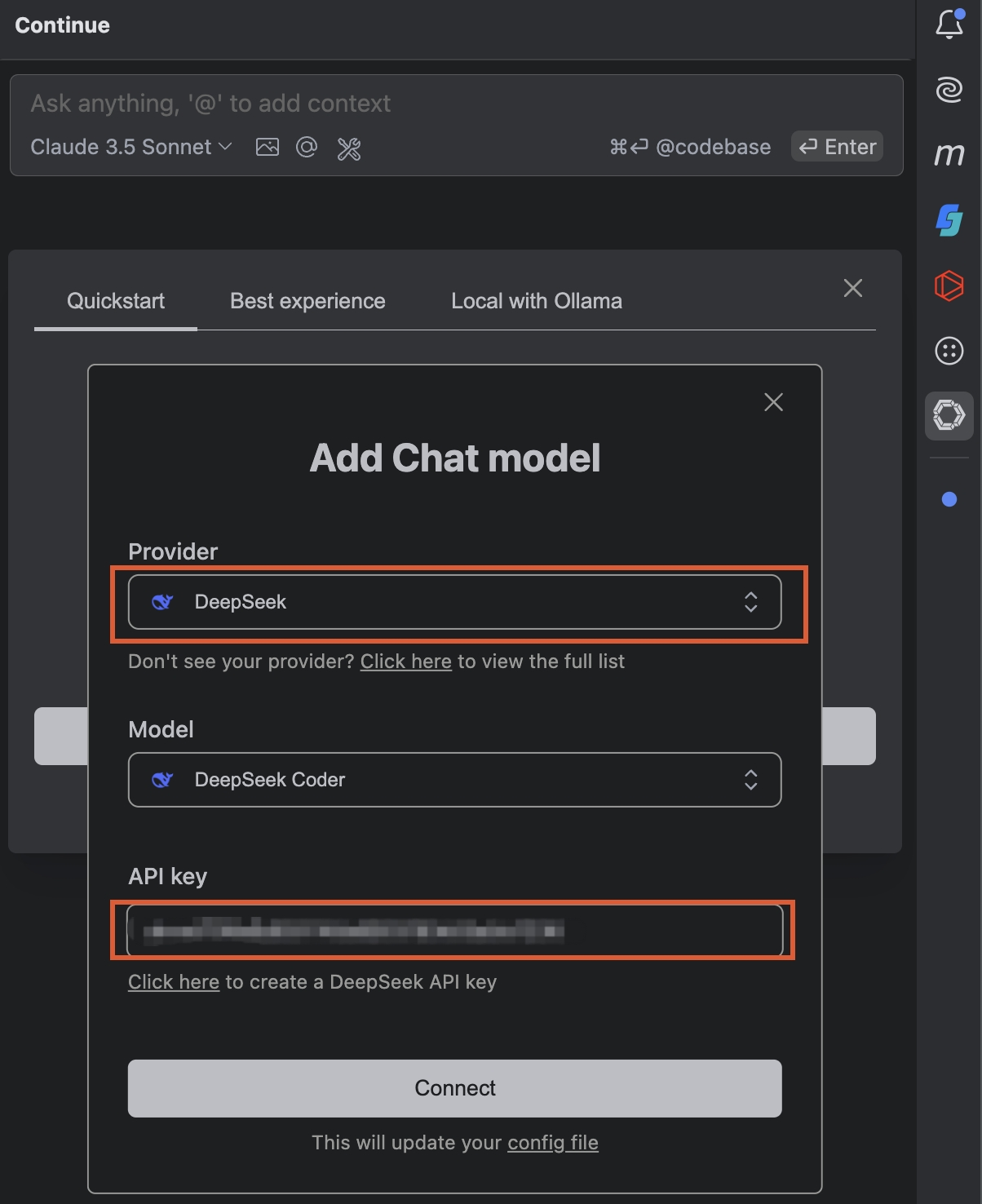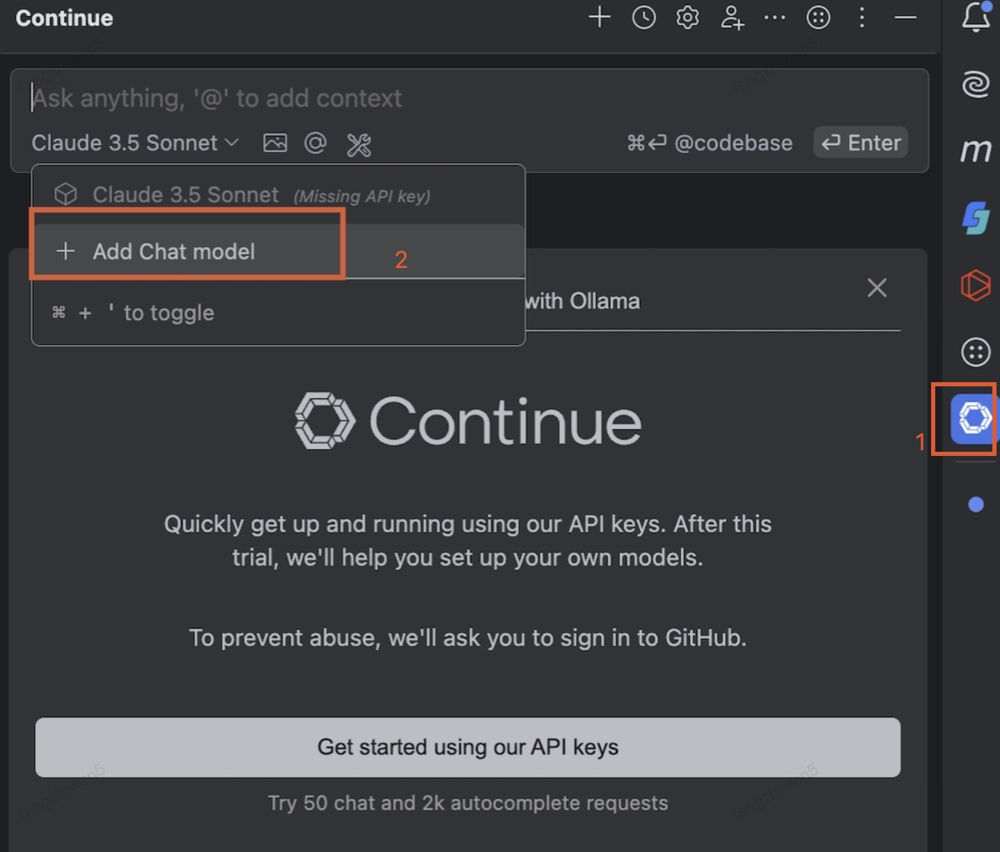 2)安装完成后,IDEA右边点击Continue按钮,并且Add Chat model添加模型