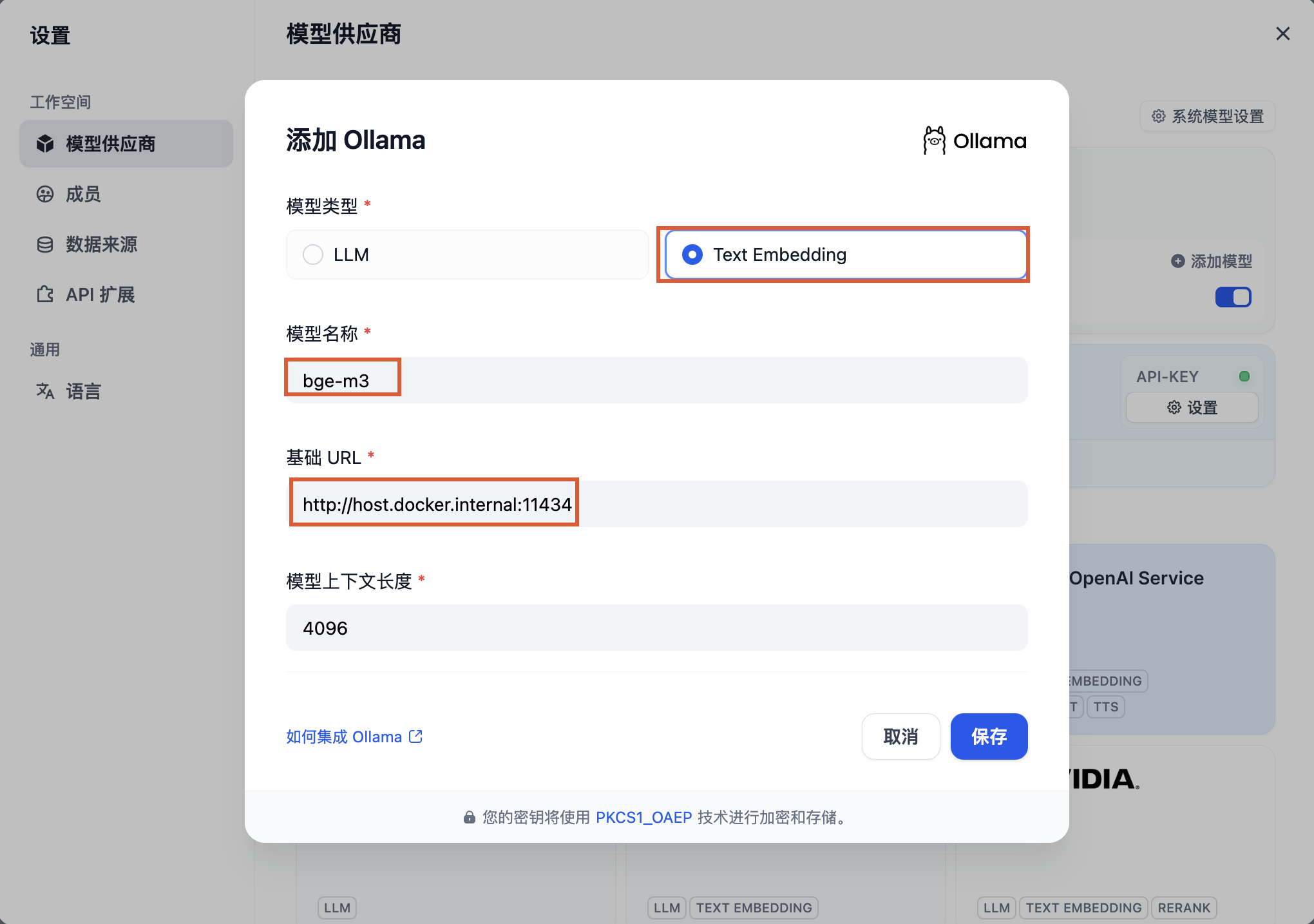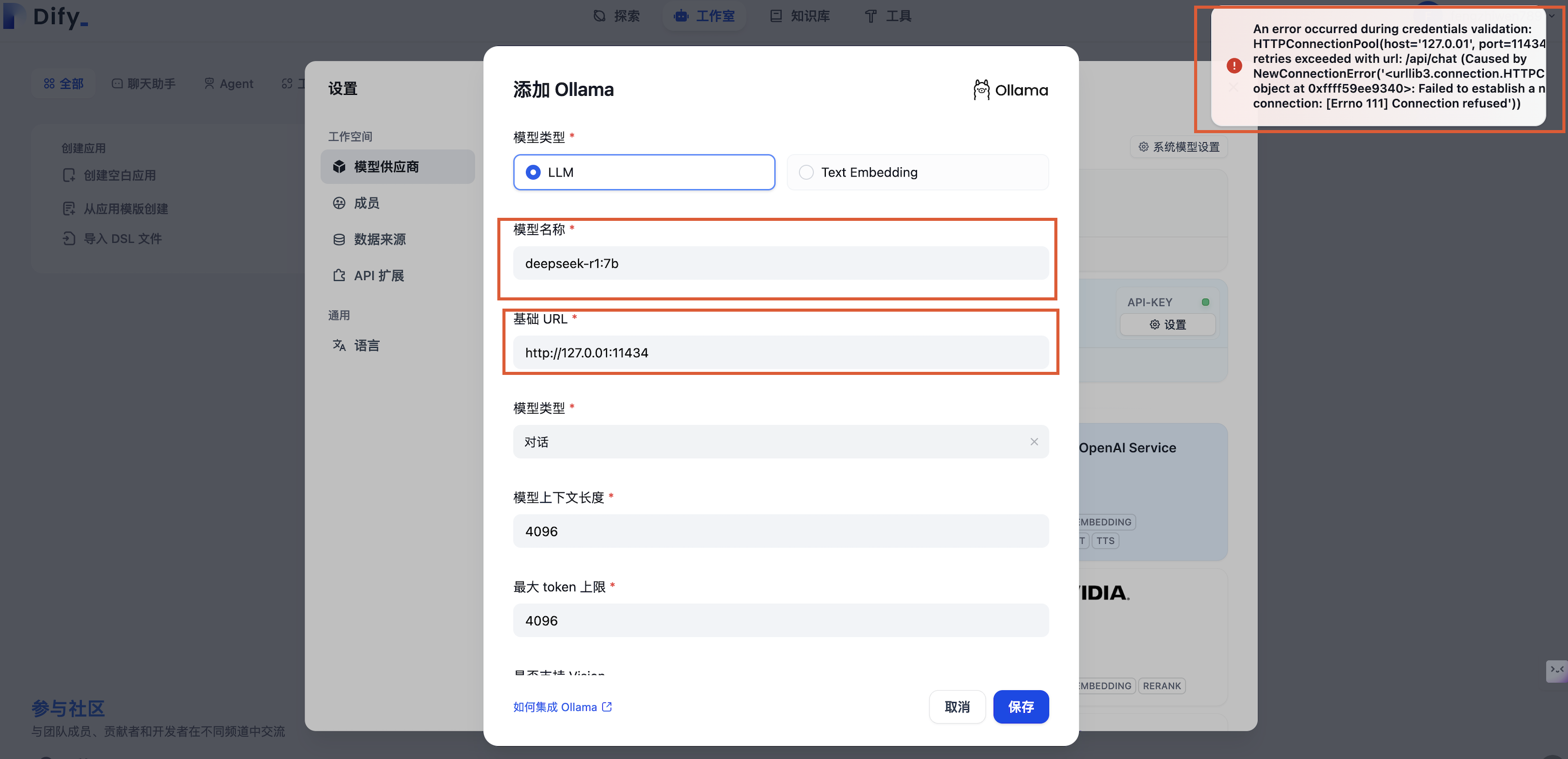 •基础URL,填写 Ollama 客户端的运行地址,通常为http://your_server_ip:11434。如遇链接问题,请查看如下Docker 部署时的连接错误
