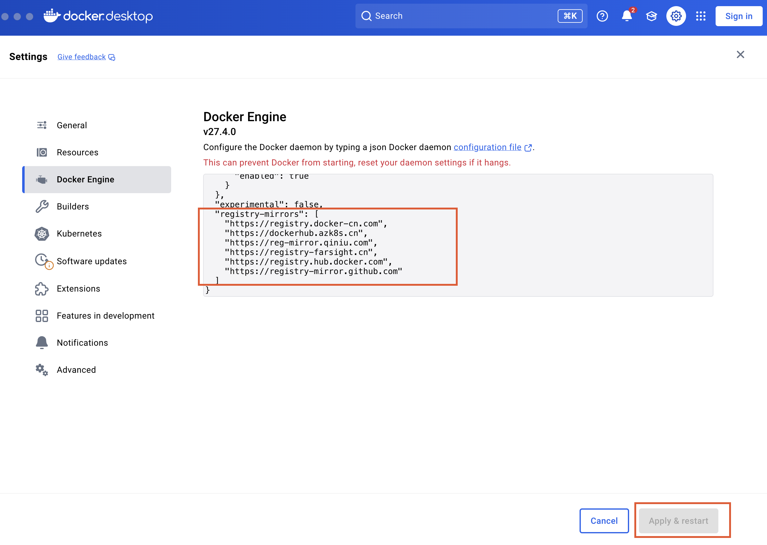 docker 镜像下载慢,修改Docker 配置,Apply&restart重启docker