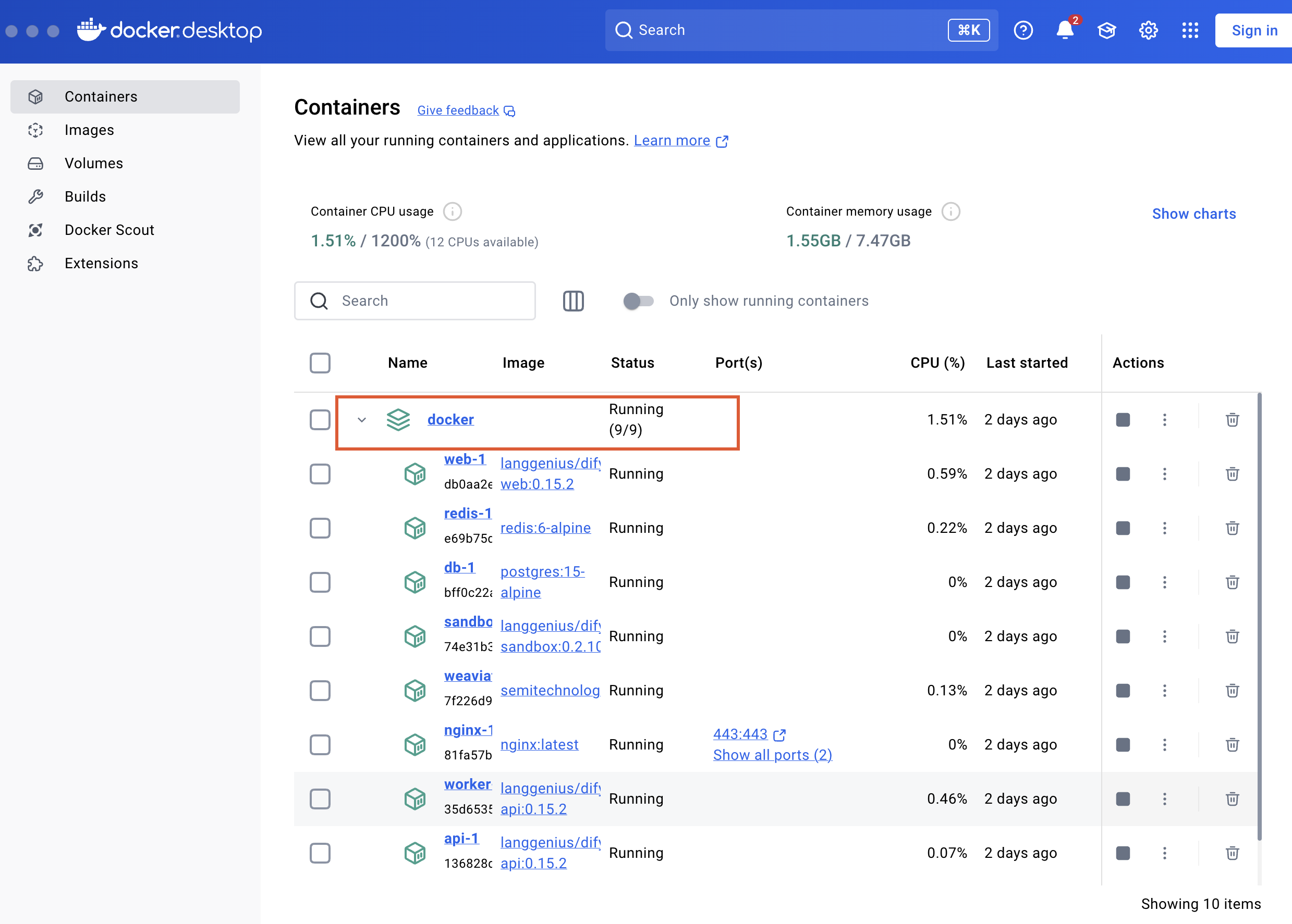 3)此时回到docker桌面客户端可看到,所有dify所需要的环境都已经运行起来了