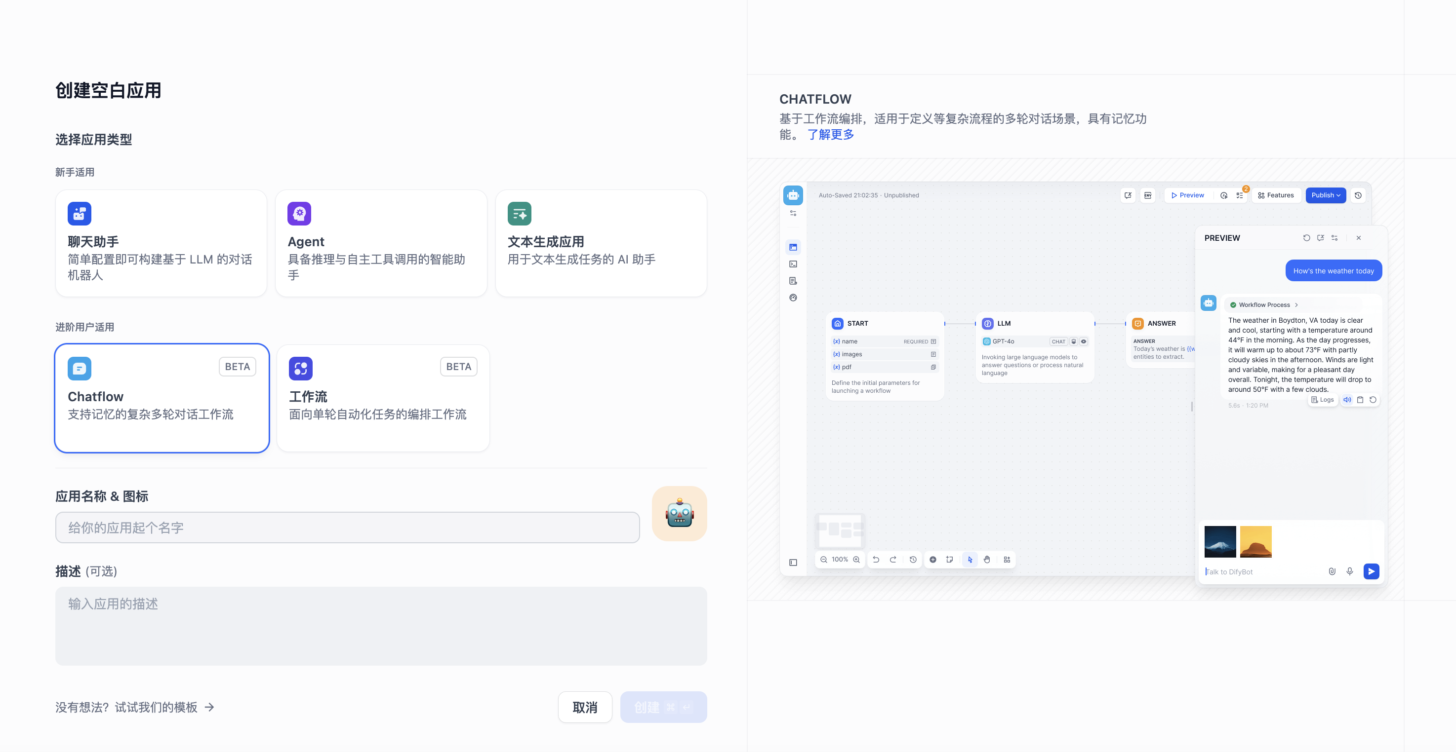•Workflow:面向自动化和批处理情景,适合高质量翻译、数据分析、内容生成、电子邮件自动化等应用程序。