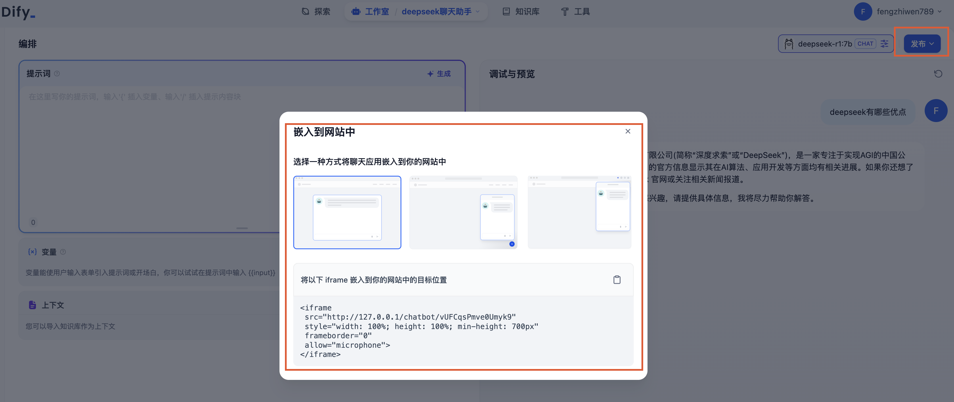 1.点击应用右上方的发布按钮,可嵌入到网站中。