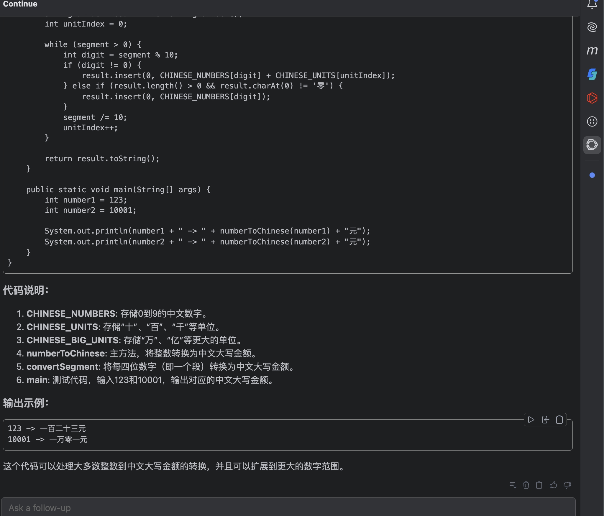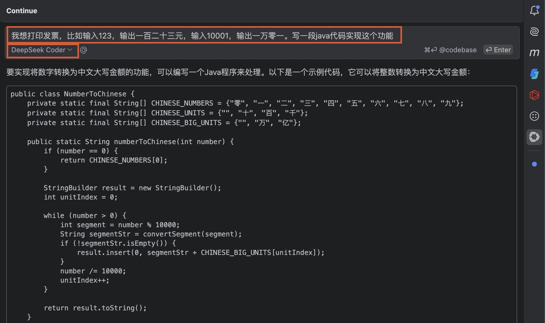 “Continue” 是一款专为 IntelliJ IDEA 设计的开源 AI 助手插件,利用大语言模型(例如DeepSeek 或其他模型)与代码的自然语言交互,极大地提高了开发效率。类似于 CodeGPT 和 GitHub Copilot,它可以实时生成代码、解决问题、创建单元测试等,帮助开发者更快、更准确地完成编程任务。
