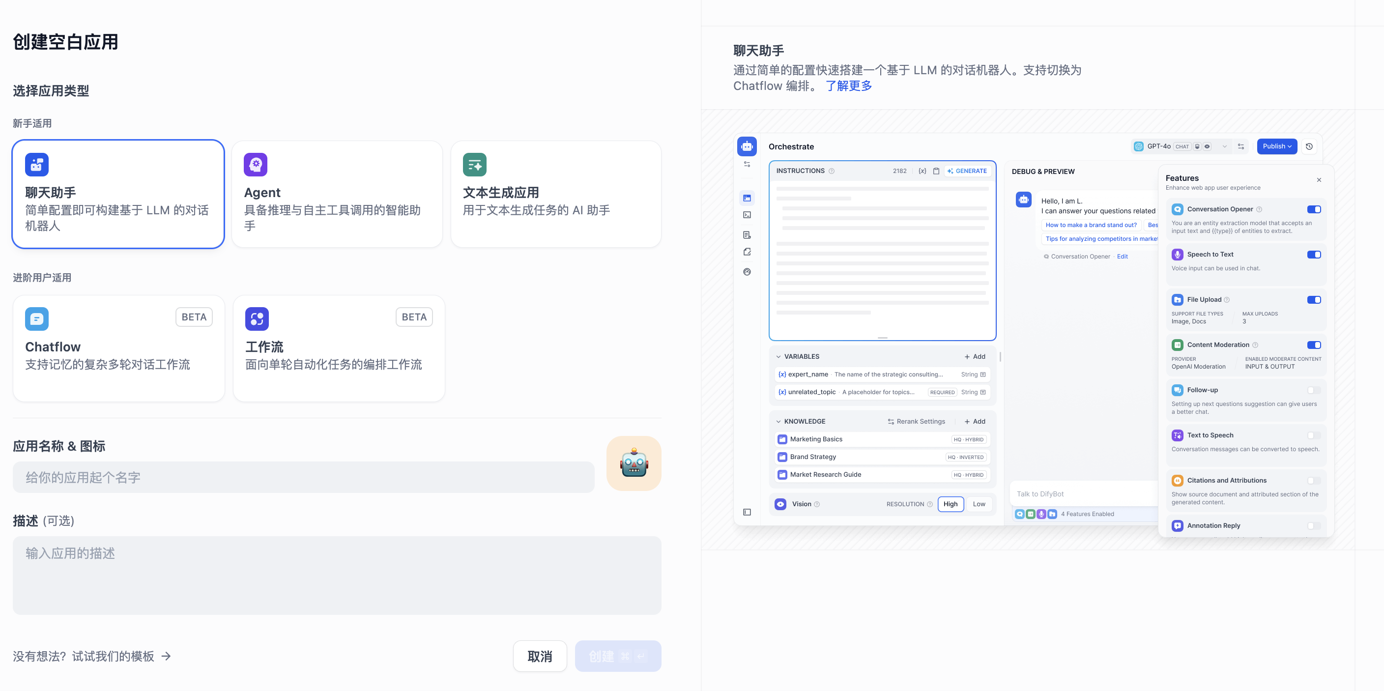 1.点击Dify 平台首页左侧的"创建空白应用",选择"聊天助手"类型应用并进行简单的命名。