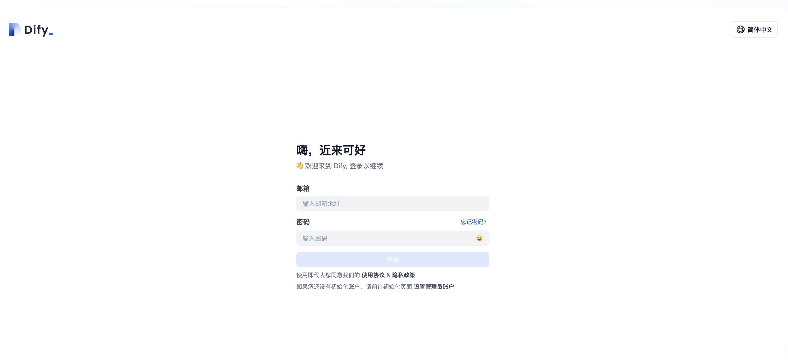 Dify 社区版默认使用 80 端口,点击链接http://127.0.0.1即可访问你的私有化 Dify 平台。