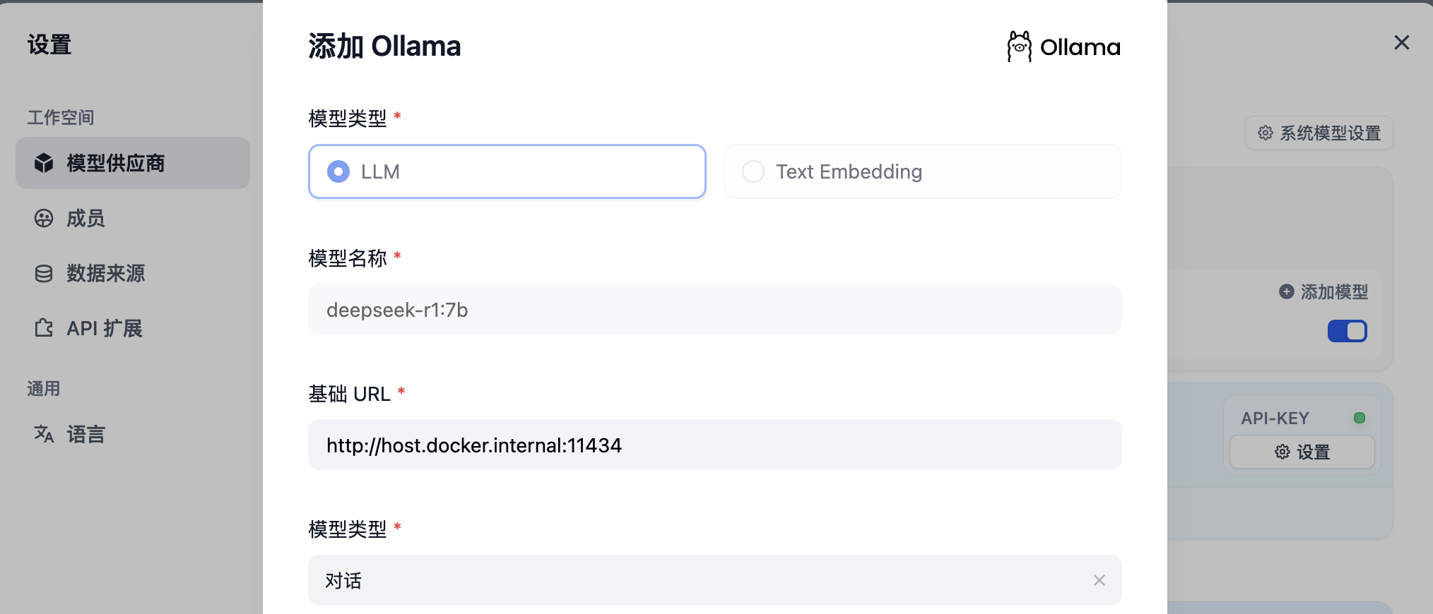 登录Dify后,点击右上角头像 → 设置 → 模型供应商,选择 Ollama,轻点“添加模型”。