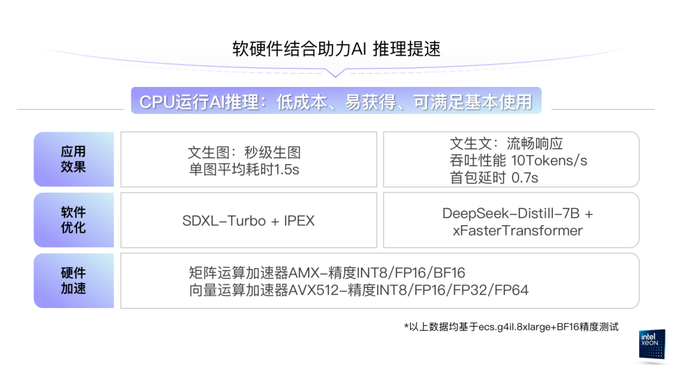 除此之外,g4il 也通过自身的软硬件结合优化提升了 AI 性能:硬件层面,g4il 支持 AVX-512 向量运算加速器和 AMX 矩阵运算加速器,同时还支持 AI 推理中常用的 INT 8、BF 16 和 FP 16 等精度;软件层面,针对文生图和文生文等场景,g4il 都提供了对应的推理引擎来充分释放硬件能力,在运行 SDXL-Turbo 时能够实现秒级的文生图能力。