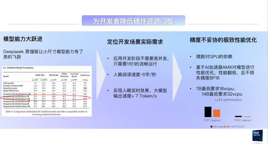 准确来说,在需要支持大规模高并发的生产部署阶段,确实需要算力更强的 GPU 等加速器硬件资源,但是在 AI 应用的开发阶段,其实需要满足 1 对 1 的“实时”性能,即每秒 > 5 token 的输出,才可以很好地支持开发需求,因为这样的速度足以达到人眼阅读速度的“流畅”标准。
