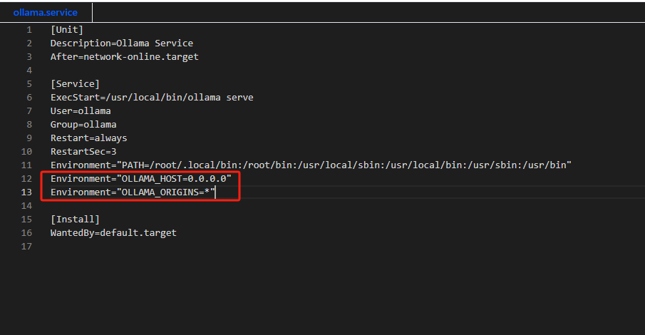 编辑 /etc/systemd/system/ollama.service 文件。 在 [Service] 部分添加: