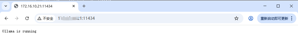 或者直接在局域网机器的浏览器中打开 http://{ollama机器ip}:11434,页面显示“Ollama is running”,说明服务启动成功。
