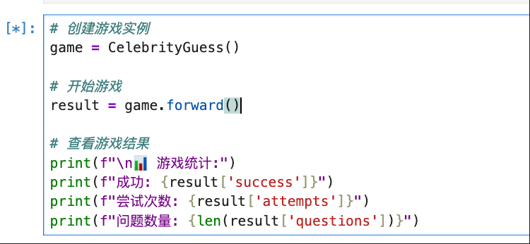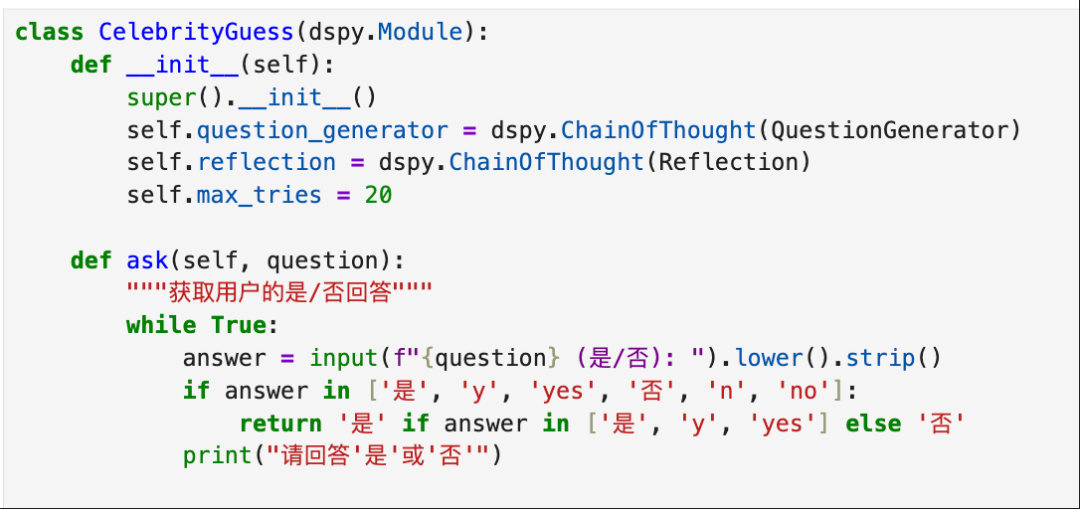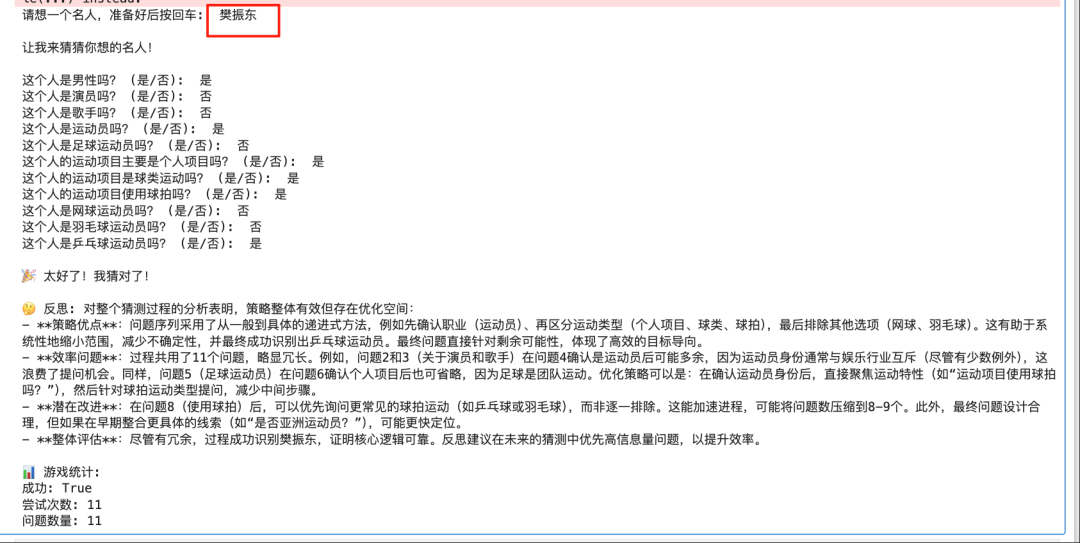 - • 游戏规则: 用户想一个名人,AI通过提问Yes/No问题来猜测