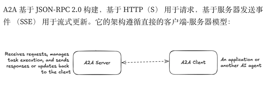 A2A 基于 JSON-RPC 2.0(请求响应)+ SSE(流式更新)。