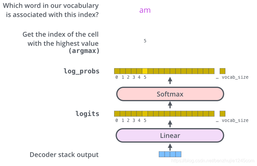 解码器栈的输出是一个 float 向量。我们怎么把这个向量转换为一个词呢?通过一个线性层再加上一个 Softmax 层实现。