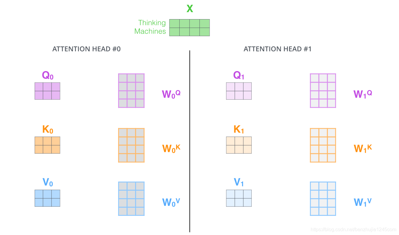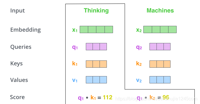 第 1 步:对编码器的每个输入向量(在本例中,即每个词的词向量)创建三个向量:Query 向量、Key 向量和 Value 向量。它们是通过词向量分别和 3 个矩阵相乘得到的,这 3 个矩阵通过训练获得。