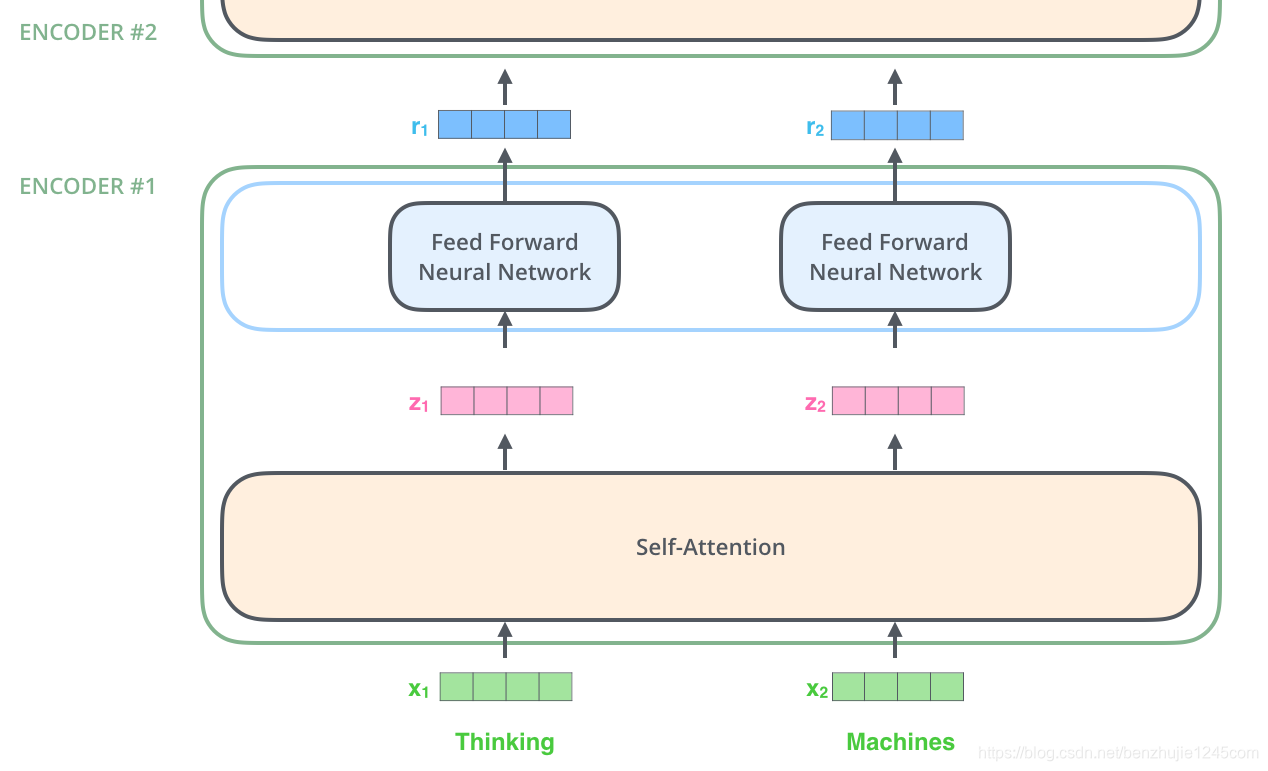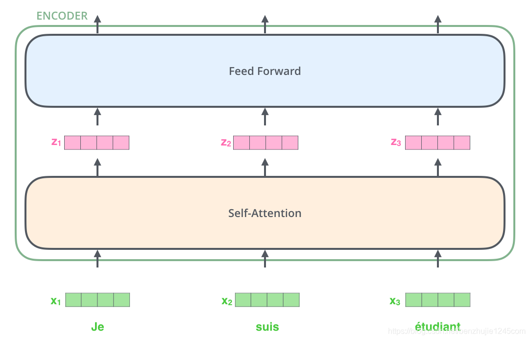 上面我们提到,编码器会接收一个向量作为输入。编码器首先将这些向量传递到 Self-Attention 层,然后传递到前馈网络,最后将输出传递到下一个编码器。