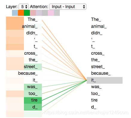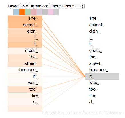 图 1.10 当我们在编码器 #5(堆栈中的顶部编码器)中对单词”it“进行编码时,有一部分注意力集中在”The animal“上,并将它们的部分信息融入到”it“的编码中。