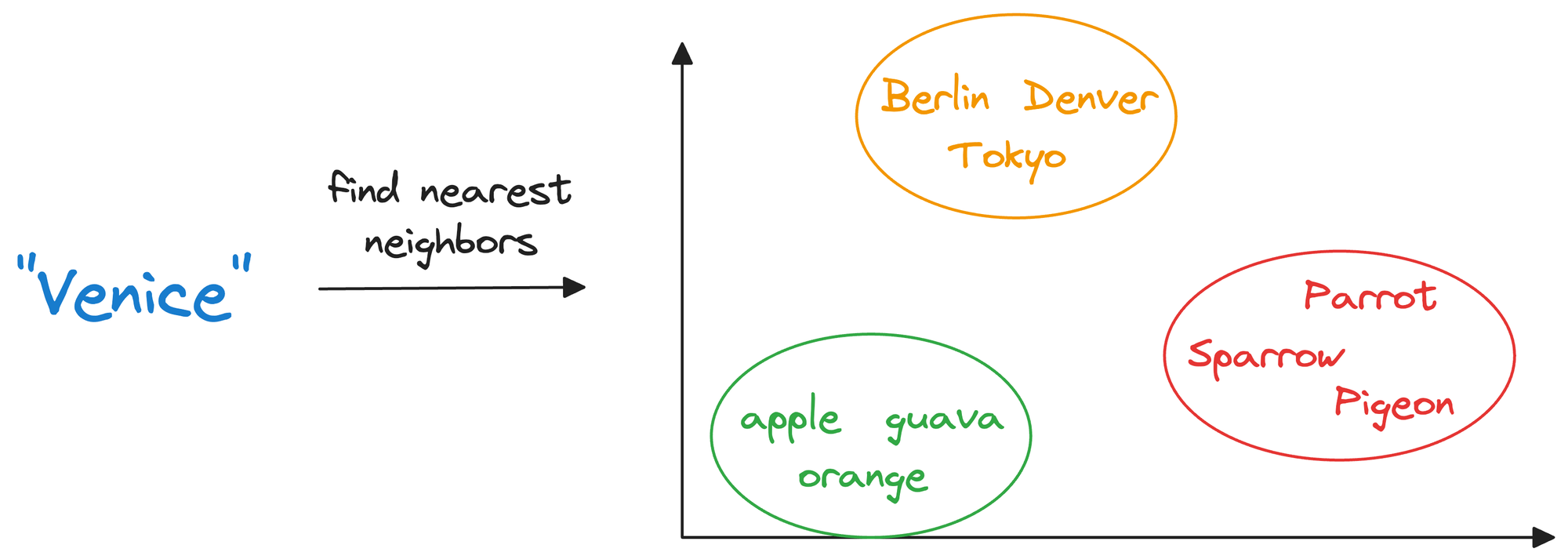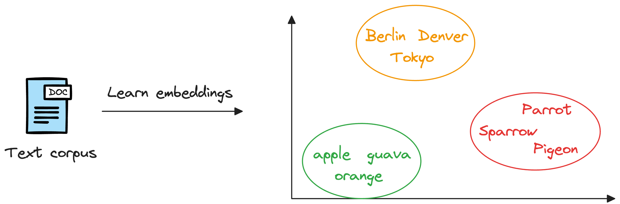 Considering word embeddings, for instance, we may discover that in the embedding space, the embeddings of fruits are found close to each other, which cities form another cluster, and so on.