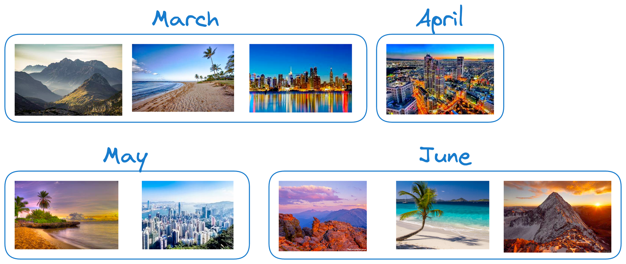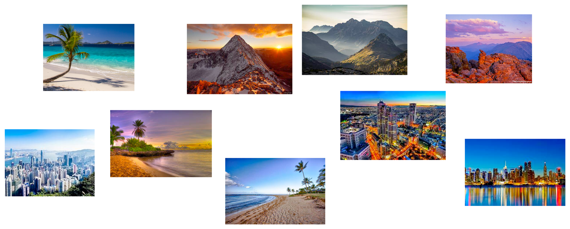 Let's imagine we have a collection of photographs from various vacations we’ve taken over the years. Each photo captures different scenes, such as beaches, mountains, cities, and forests.