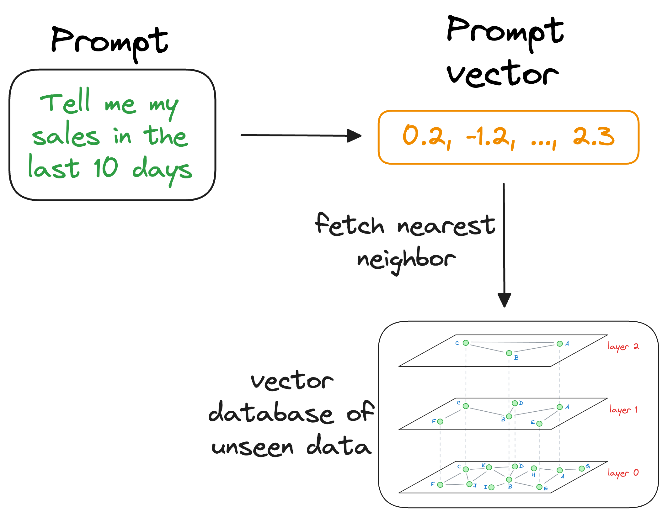 When the LLM needs to access this information, it can query the vector database using an approximate similarity search with the prompt vector to find content that is similar to the input query vector.