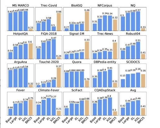 GTR研究发现,即使保持Embedding维度(如768维)不变,仅仅将双塔编码器的骨干模型从Base(1.1亿参数)扩展到XXL(48亿参数),模型在跨领域检索基准(BEIR)上的性能也会持续、显著地提升。这表明,更大的模型容量能够学习到更鲁棒和可迁移的语义表示。