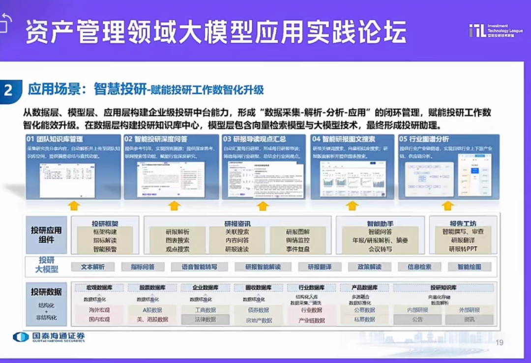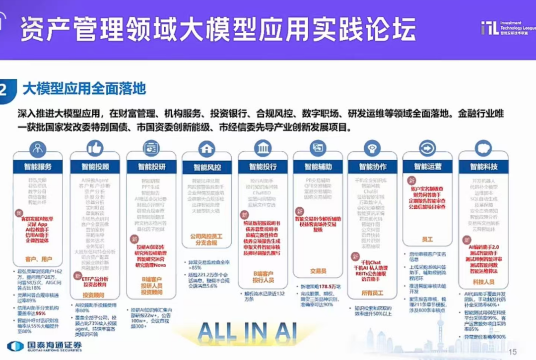 当前行业大模型应用建设水平: 大型机构已经All in AI, 如蚂蚁集团,国泰海通,工商银行,其它资源有限的则重点挖掘核心业务领域的AI应用,如基金在智能投研。
