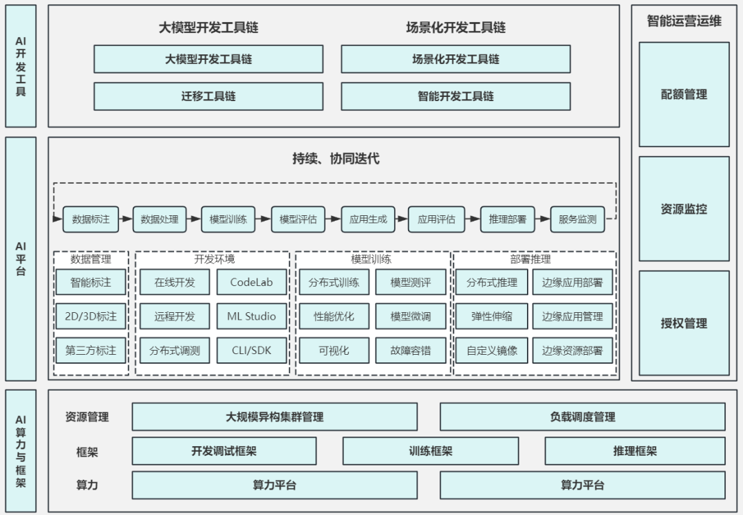 - 开发环境与实验管理:在线 Notebook、远程开发、分布式调测、CodeLab/ML Studio、CLI/SDK 等,强化可复现性和协作能力。