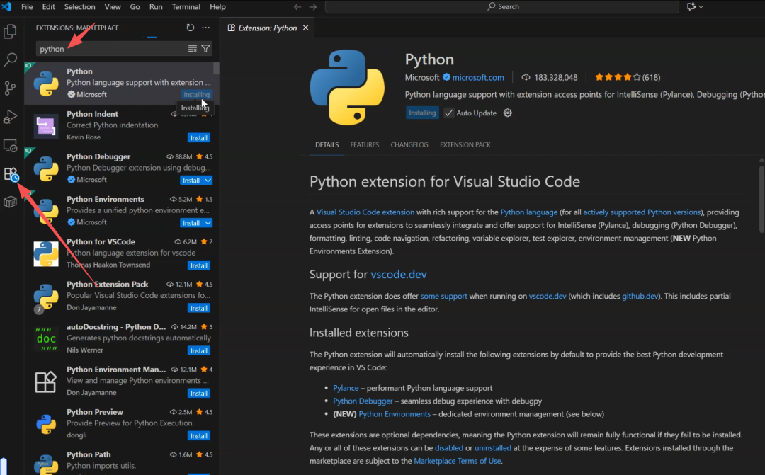 在搜索框输入 Python,选择第一个插件并点击安装。