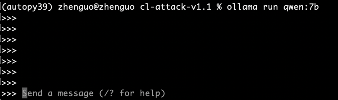第三步,ollama run qwen:7b,执行这条命令后,我们就可以和大模型对话了: