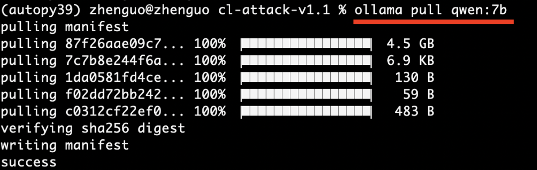 第二步,命令窗口输入:ollama pull qwen:7b,下载大模型qwen7b到我们自己的电脑: