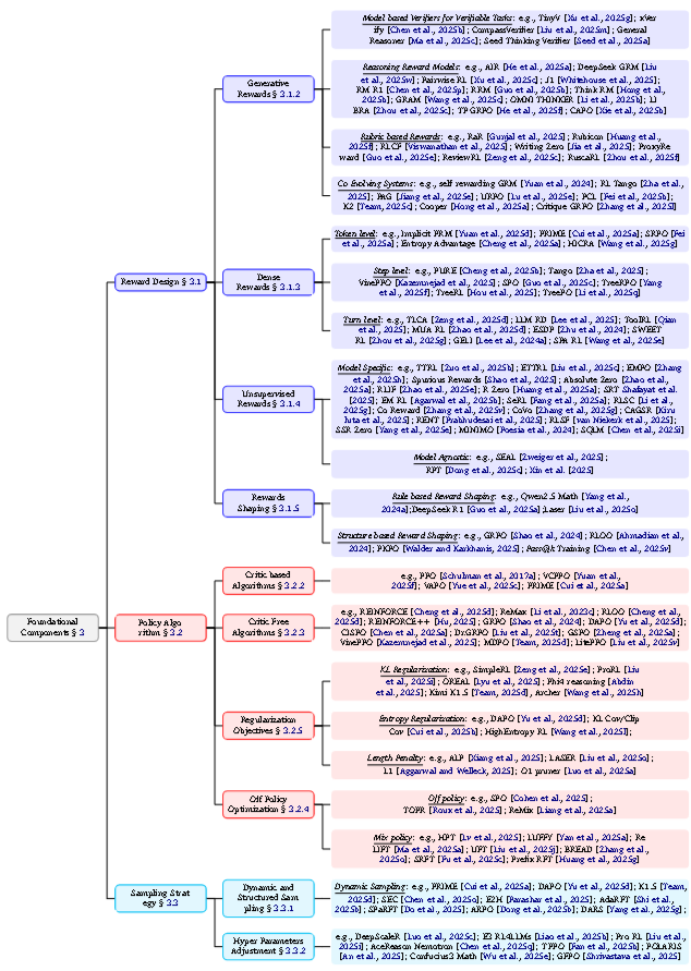 用于平衡探索与利用,增强 RL 效率和策略性能。包括 KL 正则化(约束当前策略与参考策略或旧策略的距离,以防止灾难性漂移)、熵正则化(鼓励探索,避免熵坍塌)和长度惩罚(管理生成序列的长度,平衡推理深度和计算成本)。