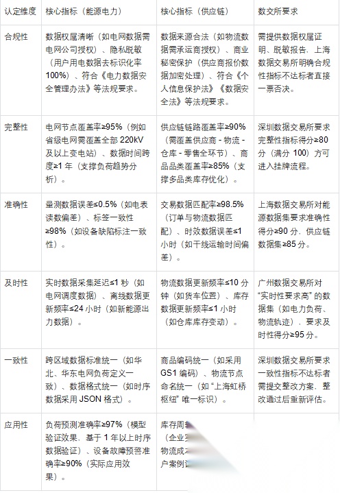 高质量数据集需通过“合规性、质量性、应用性” 三重认定,国内数据交易所(以上海、深圳为例)已形成明确评价体系,结合能源电力与供应链特性,核心指标可归纳为以下 6 类: