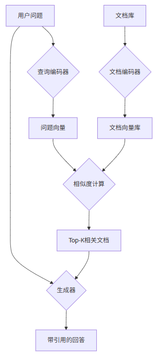 RAG的核心创新在于双塔模型(Dual-Encoder)架构,查询与文档分别通过独立但参数共享的编码器转换到同一向量空间。这种设计使系统能在毫秒级时间内从百万级文档中找到相关内容,就像图书馆通过分类号快速定位书籍而非逐本翻阅。