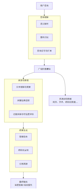 如果DeepSearch是帮你快速找到答案的“研究助理”,那么DeepResearch就是一个可以独立完成一个研究课题的“初级研究员”。DeepResearch代表了知识处理的更高阶段,实现了从“信息检索”到“知识创造”的跨越。它能模拟人类研究员的完整工作流程:理解研究目标→规划研究步骤→搜集多元信息→交叉验证→综合分析→生成报告。这种能力使其在学术文献综述、市场深度分析、政策影响评估等领域大放异彩。