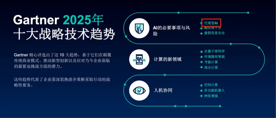 Gartner将智能体人工智能(Agentic AI)列为2025年十大技术趋势之首,这种具备自主决策能力的机器智能已突破传统聊天机器人的局限,可在无人工干预下完成复杂企业级任务。