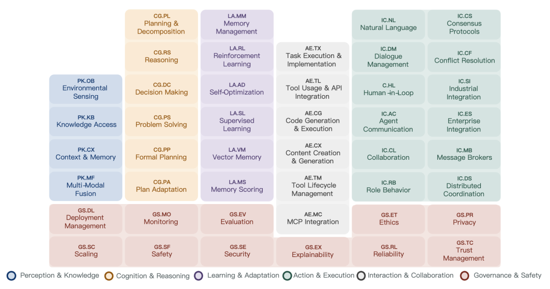 数字孪生联盟推出了AI智能体能力周期表(AIA CPT),为理解和部署智能体人工智能系统提供了全面框架。该周期表将45项能力划分为6个核心类别: