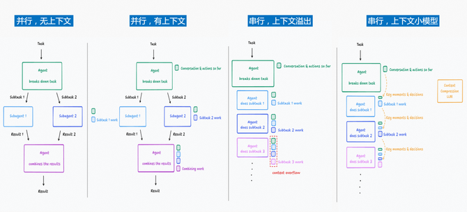 任务由多个 SubAgent 串行完成,前一个 Agent 的输出成为后一个 Agent 的输入,构建一种“任务接力”模式。优势是子任务之间能被相互看到,任务理解更统一。但是任务过长时,串行产生的上下文会迅速膨胀,最终可能超过模型上下文窗口的容量限制,导致上下文溢出。工程中,如果我们设计的流水线很长,最终导致缓存溢出的可能性就会变大,其实是同样的原理。