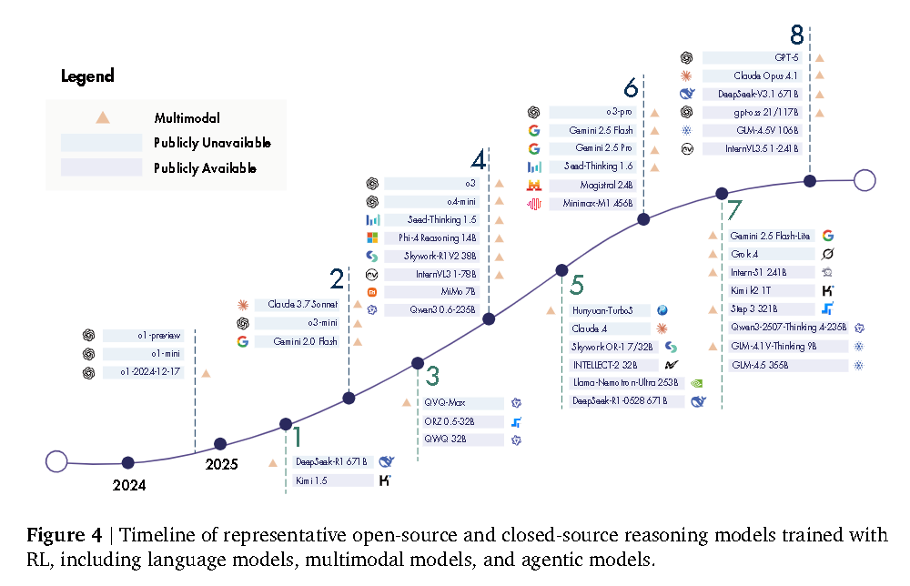 通常辅以 KL 散度正则化以稳定训练。随后,文章概述了自 OpenAI o1 以来,诸如 DeepSeek-R1、Claude、Gemini、Qwen、Skywork-OR1 等一系列前沿模型的进展,它们在推理、Agentic 任务和多模态能力方面推动了 RL 的应用。