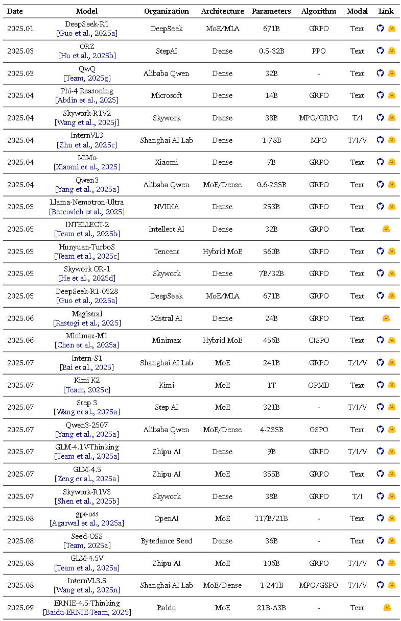 - 以OpenAI o1和DeepSeek-R1为代表的模型,通过可验证奖励强化学习(RLVR)实现了规划、反思和自我纠正等高级推理能力,开辟了超越预训练的新扩展方向。