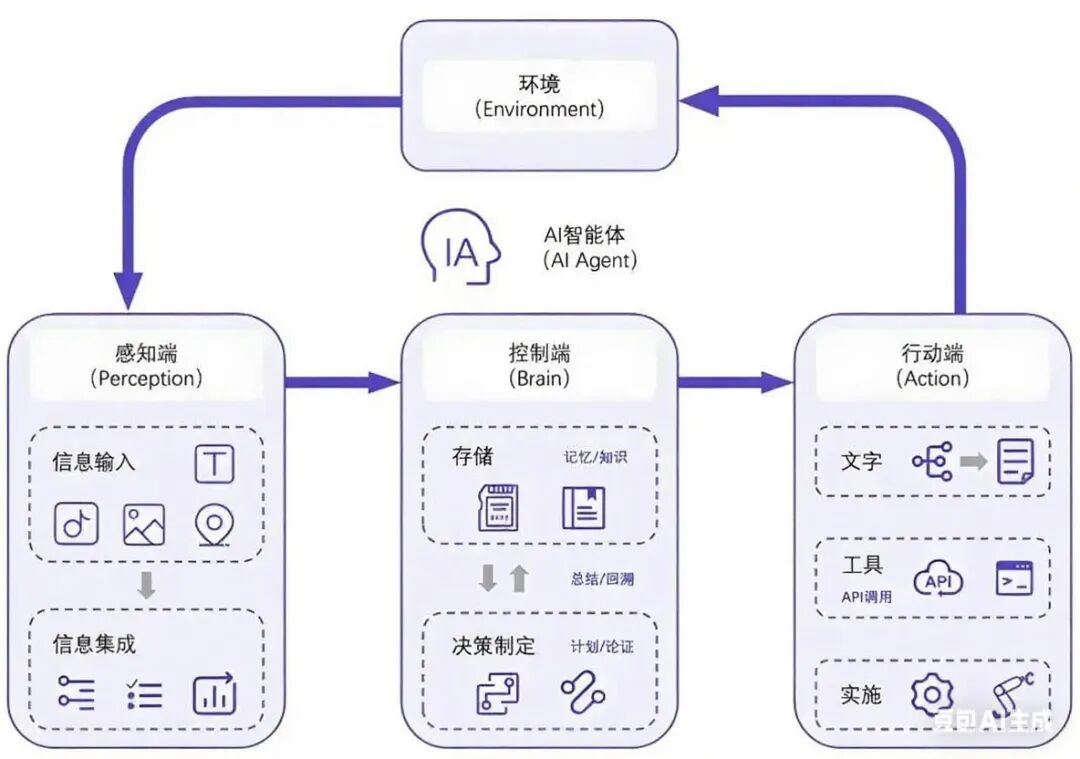 要搞懂 AI Agent 为何能实现自主决策和行动,就得深入了解它的技术架构。简单来说,AI Agent 是具备自主感知、分析决策和执行能力的智能系统,其核心架构由三大模块构成。