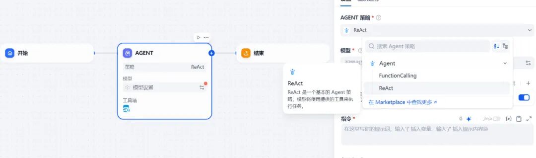 配置Agent节点,在设置中,选择安装好的策略,直接选择Agent下的ReAct节点,在模型设置选项中设置自己的模型。