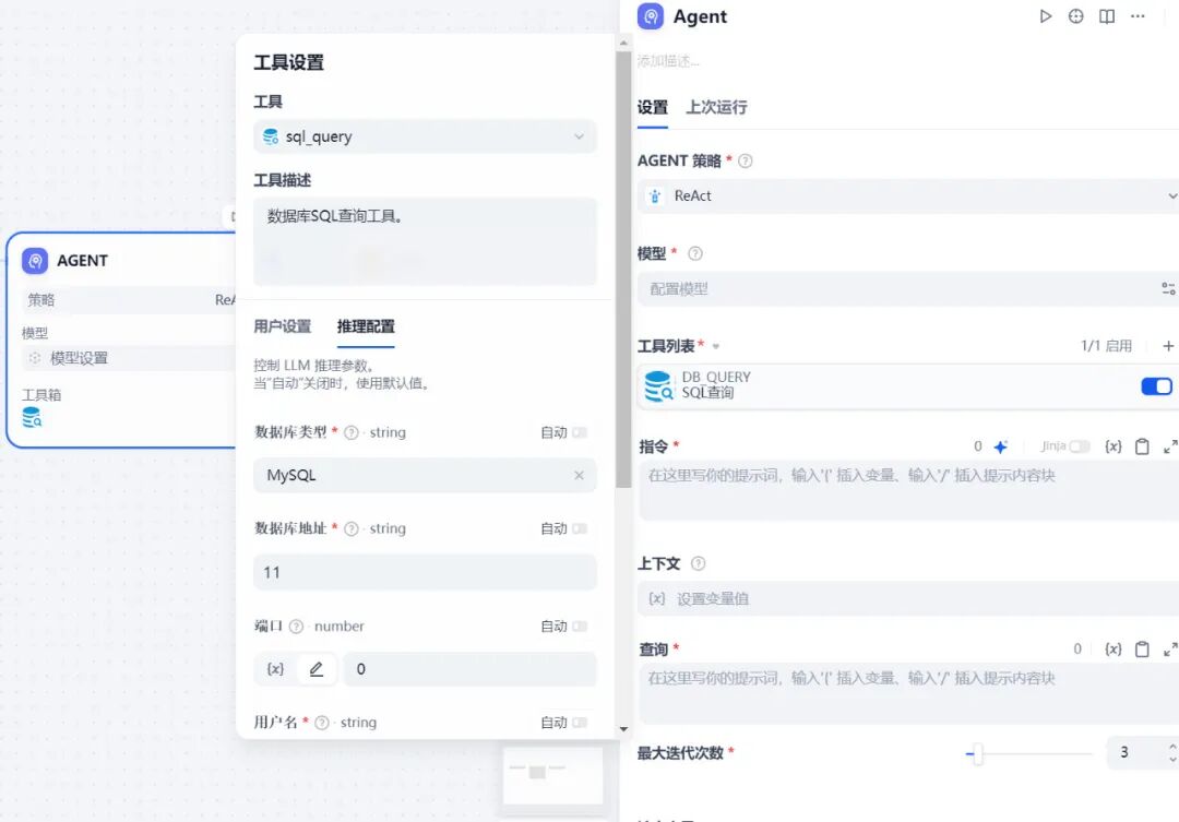 配置数据库查询节点,在工具列表一栏,点击右侧的加号,选择自己已经安装好的数据库SQL查询插件,然后选中插件,在弹出的窗体中,选择“推理配置”选项卡,然后设置数据库类型、数据库地址、端口、用户名、密码、库名等信息,其他选项默认。