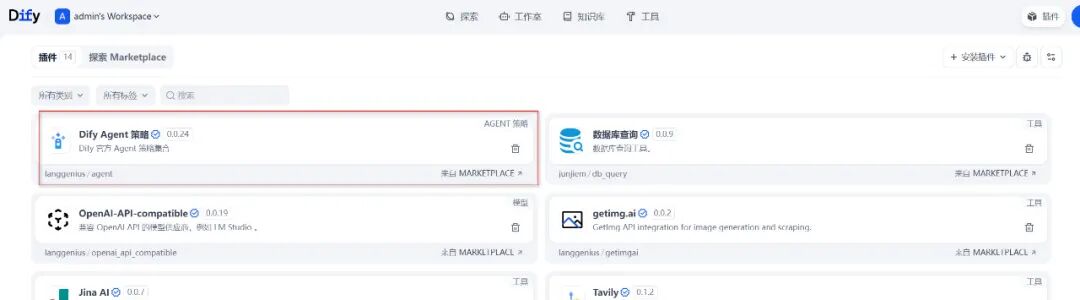 在完成该工作之前,需要先给Dify安装一个必要的插件:Dify Agent策略,然后再该策略中进行必要的配置,完成目标功能。