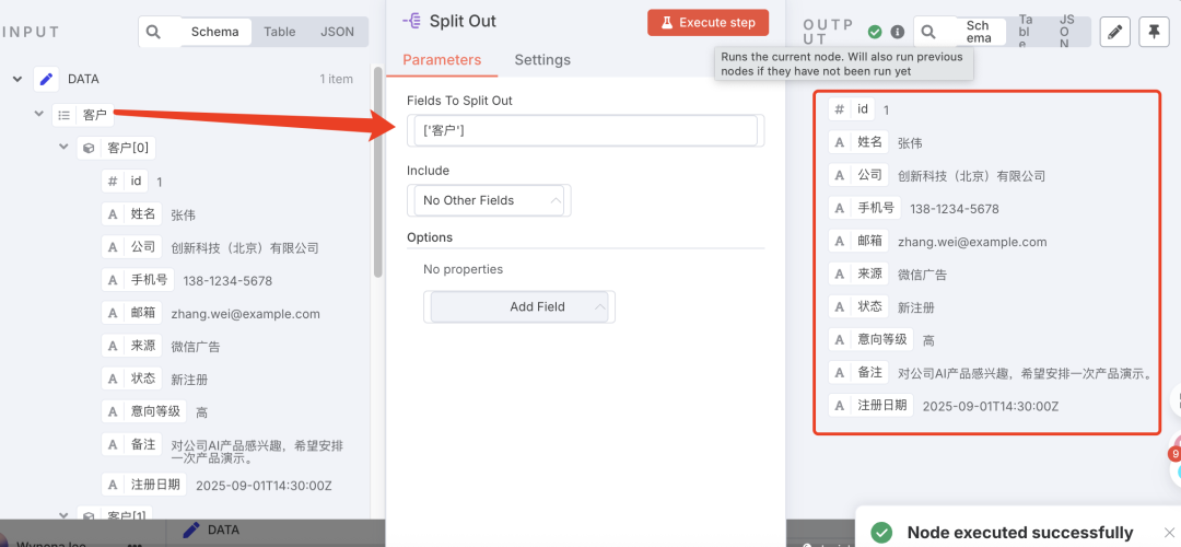 - 运行和输出: 运行节点后,处理后的数据将作为节点的输出,传递给工作流的下一步。
